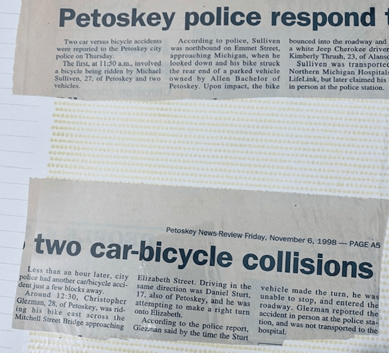 It was 37 degrees that day with flurries of snow, I know because I remember freezing my ass off while trying to process what had just happened and the historical weather records confirmed the stupidity of this scenarios setting. The thirty-minute lunch period we were allotted that particular Friday was used to drive to Scooby’s liquor store just 3 miles away to peruse Katarina and her double…gold medals, then jet back to school. After successfully being 17-year-old idiots and finally pissing off the clerk we left, morale boosted as we headed back for the second half of A.P. Lit. Less than a quarter mile from the store is the only bridge in Petoskey with an immediate right turn as it ends that is now curbed off and non-existent, most likely due to incidents like the one that happened on that fateful November day. As I hung that roger onto Elizabeth Street a sudden impact hit my SUV’s right flank like bird-strike. The human being who suddenly flew over my hood and onto the pavement after elicited reactions of open-mouthed shock, then laughter as we saw this inebriated moron who was on a bicycle in a snowstorm in November, pop right back up after hitting my car. As we questioned if he needed help, a ride to the ER, Cops or anything else the man kept flatly refusing. His knee was cut-up but nothing serious considering the distance he had flown and his landing spot. Finally, my friend who was the passenger and totally devoid of any responsibility asked the most obvious question as we all shivered. “What are you doing out here right now on that thing?” His answer still echoes in my memory, the sound of it slurring and smell of cheap gin still permeate my mind. He exclaimed “I was kicking some ass on my bike!” prompting my friend to have to physically turn away from the conversation to conceal his laughter.